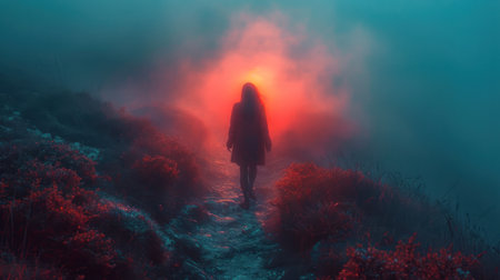 Mysterious foggy landscape with a young woman walking in the fog