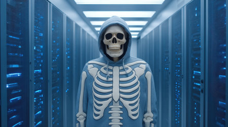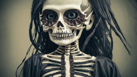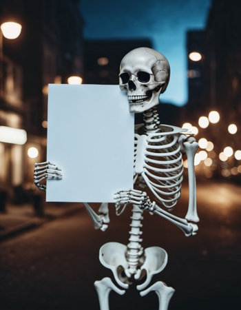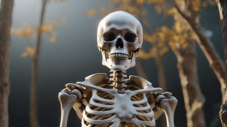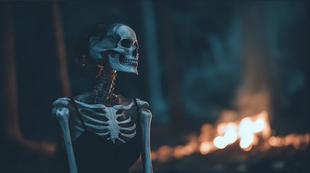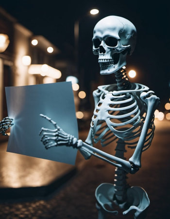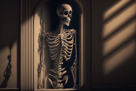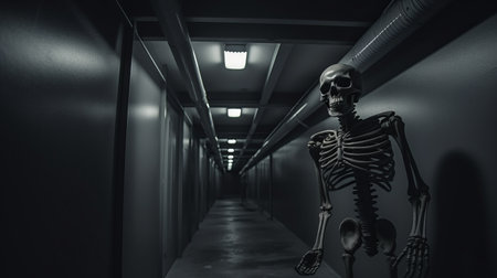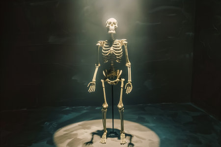 A human skeleton is illuminated by a spotlight, standing upright in a dim setting, creating a chilling and eerie atmosphere with a touch of drama