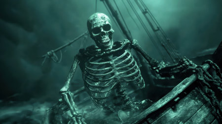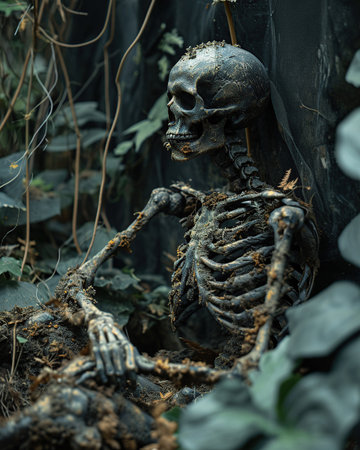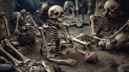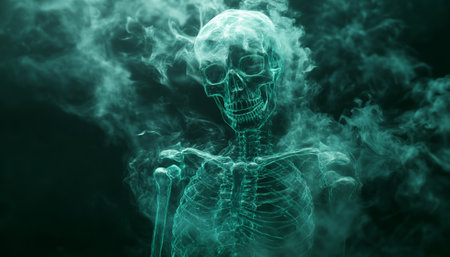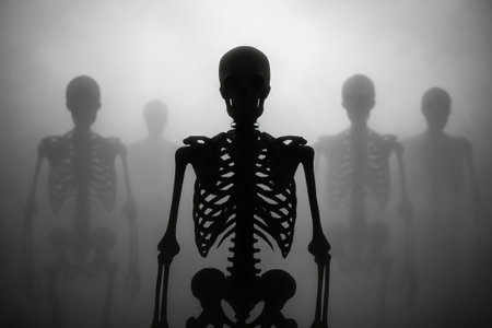 Mysterious skeletons in thick fog creating eerie atmosphere and haunting scene. concept of halloween decor, spooky mood, chilling ambience.