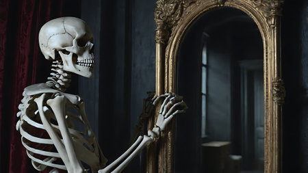 a human skeleton against a mirror surface. reflecting skeleton