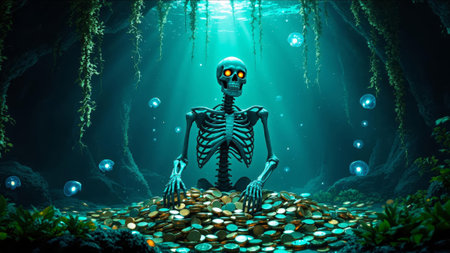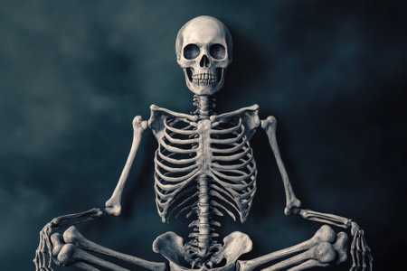 A skeleton sits in a meditative pose, surrounded by a dark background exuding tranquility and stillness.