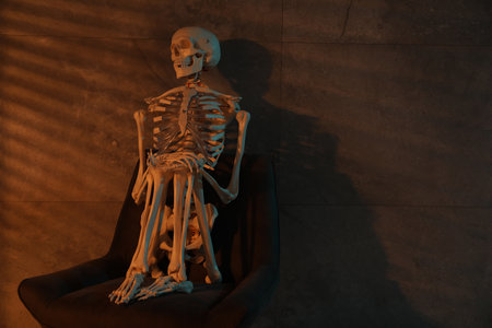 Waiting concept. Human skeleton sitting in armchair indoors, space for text