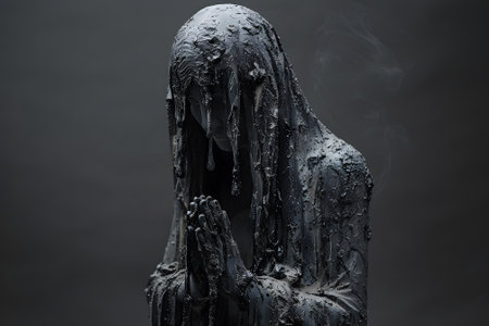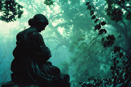 Front view closeup detail of dark woman stone statue covering her breasts with one hand with bare trees branches in the background