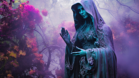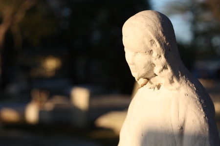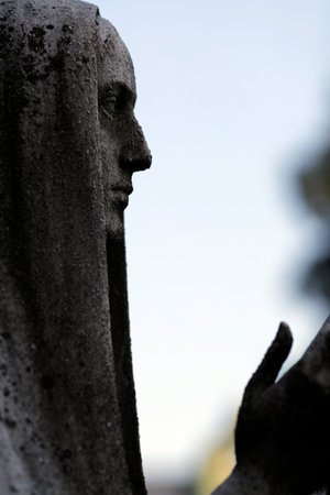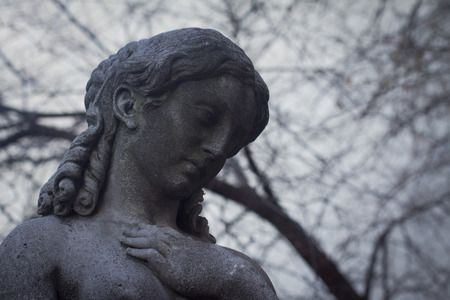 Worn stone angel. Vintage female figurine with shabby paint on her face. Monument in a cemetery. Old statue close up. Sadness, longing, depression.