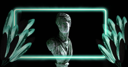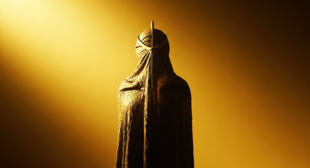 A detailed statue of an ancient warrior, draped in fabric and wearing a helmet, is dramatically illuminated by a golden spotlight against a dark background. Clear details and vibrant colors enha...