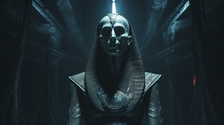 Figure allusive to Pharaoh, isolated on black background seen from front.