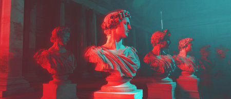 Fragmented statues illuminated by neon highlights in an artistic display
