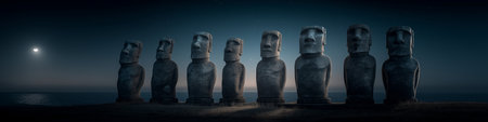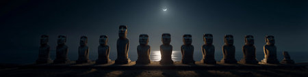 Ancient Moai statues standing by the ocean under a night sky with bright moonlight. Moai statues on Easter Island watching rising moonlight