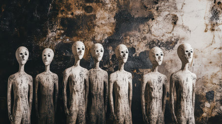 Seven white mannequins stand in a line against a rustic textured wall creating a striking visual contrast in a creative setting.
