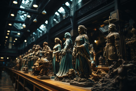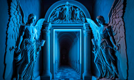 Hallway with statues and blue light. Generative AI.