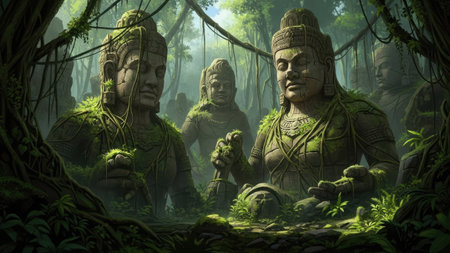 This image showcases weathered stone statues surrounded by vibrant green vegetation. The composition features multiple figures, bathed in soft, diffused light, suggesting a natural outdoor environment. The texture of the statues contrasts with the lush plant life. Ideal for illustrating historical, cultural, or artistic themes in various commercial applications.
