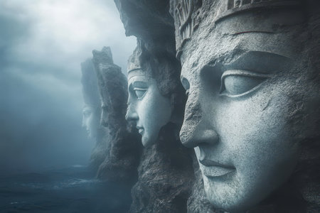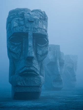 A series of carved stone faces emerge from a misty sea, creating a surreal and mystical landscape.