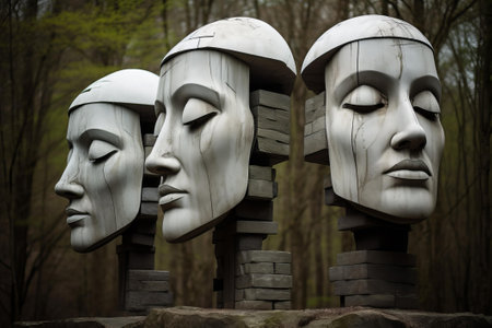 a stone face sculpture, perched atop a rugged rock wall, showcases the artistic style of cubist fragmented reality. with vray tracing, torn and distressed edges, this hyperrealistic creation captivates viewers. crafted by a skilled wood sculptor, the sculpture exhibits a gloomy ambiance, achieved through the heavy use of palette knives. ai generated