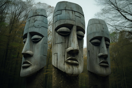 mysterious stone faces in lush forest
