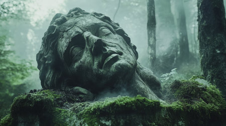 Giant stone head resting in a foggy forest