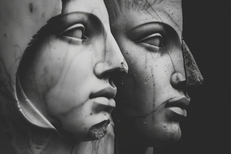 A black and white photograph of two ancient stone faces, eroded by time, their expressions hinting at a silent conversation.