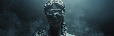 A close-up shot of a blindfolded statue of justice, with dramatic lighting and a smoky background.