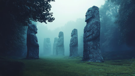 An eerie grove with towering ancient stone statues shrouded in thick, mystical mist, evoking mystery and timelessness