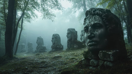 A misty forest clearing with ancient stone statues, their faces worn by time, surrounded by an eerie, haunting silence