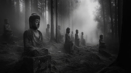 A dark forest grove filled with ancient, weathered stone statues hidden within swirling mist, creating an atmosphere of haunting beauty