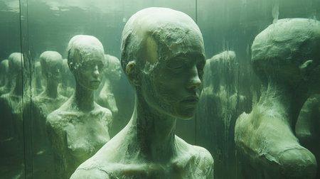 Rows of ghostly pale, bald mannequins with bio mechanical textures fill a mirrored room. Reflections amplify the ambiance, with hazy lighting enhancing the mysterious interplay of shadows.