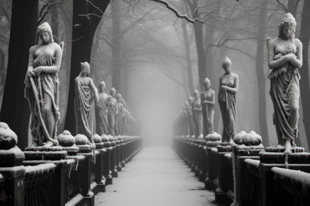 Snow-covered Statues and Monuments: Explore the contrast between historical or artistic structures and the wintery environment. - Generative AI