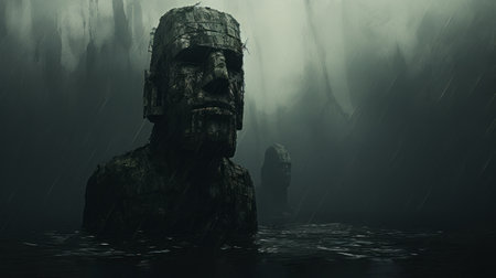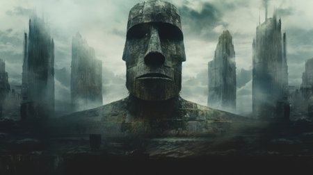a cinematic and minimalistic shot of a printmaking artwork, inspired by the styles of beksinski, hyperdetailed, easter island, and jeremy mann. this visually captivating piece combines intricate details with a sense of mystery and depth, creating a unique and thought-provoking composition. ai generated