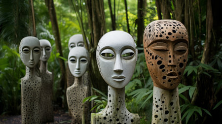 An AI generated illustration of a collection of ornamental stone statues arranged in an outdoor garden amidst a lush foliage of green foliage