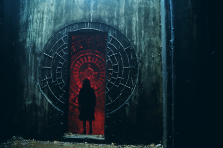 a person standing in front of a red door