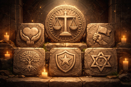 Various stone symbols positioned on a structure, illuminated by candles in a muted environment. Each symbol represents different themes and values.