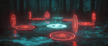 Mysterious glowing magic runes reveal ancient symbols of power in a dark setting