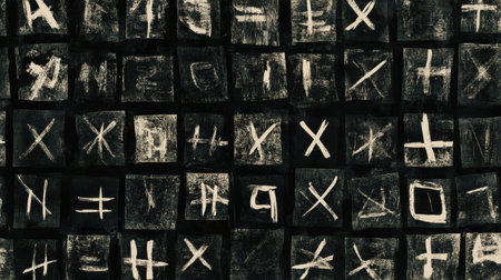 This abstract artwork features textured grids with artistic symbols in a striking black and white contrast, ideal for enhancing modern home decor.