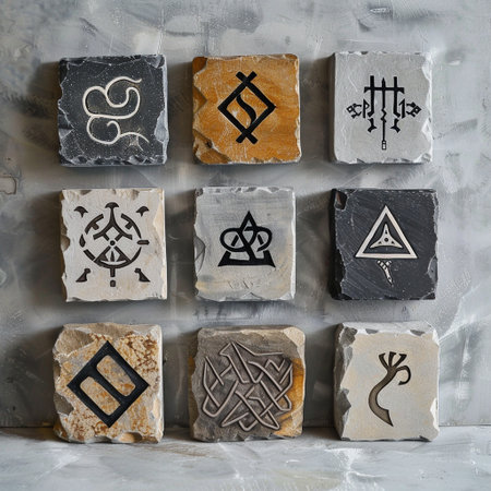 arrangement of protective runes exhibits intricate carvings on a textured surface bathed in soft light highlighting their spiritual significance and craftsmanship.