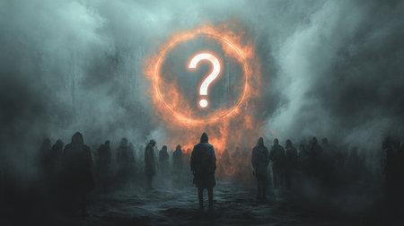 Mysterious gathering beneath glowing question mark in the fog