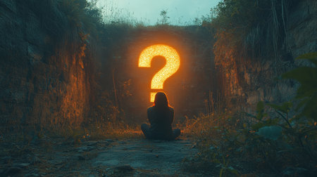 Mystical scene of a person sitting in front of a glowing question mark in the forest, contemplation and mystery concept