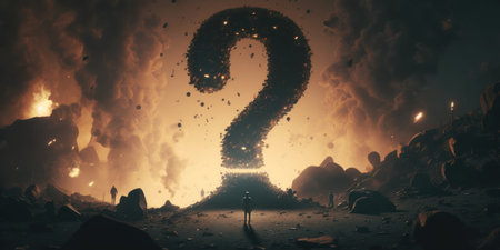 Rugged stone question mark emerging from shadows with dramatic lighting