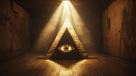 This captivating image features a stone pyramid with an eye symbol, dramatically illuminated by light streaming from above, creating an atmosphere of mystery and intrigue.