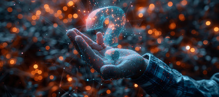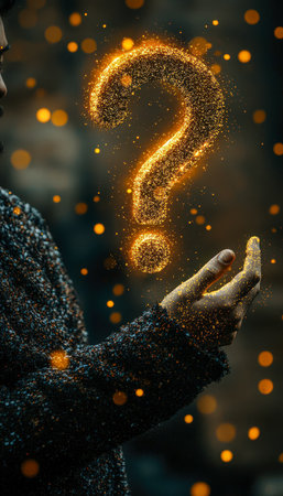 A hand with fingertips gently clutching a luminous question mark shimmering with glittering particles, evoking intrigue and the allure of the unknown.