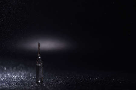 Sars-Kov-2 vaccine in a transparent glass ampoule, covered with frost, on a dark background, short focus, toning