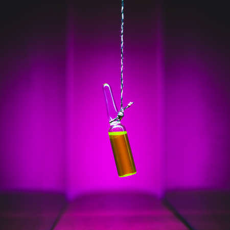 euthanasia concept. Ampoule suspended on the suicide loop. death penalty by means of chemicals. artistic dark filter