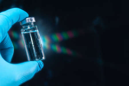 Horizontal shot of hand in a medical blue glove holds a vial. Medical concept.