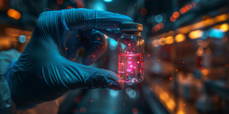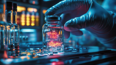 A scientists gloved hand carefully handles vial containing glowing liquid, surrounded by laboratory equipment. scene conveys sense of precision and innovation..
