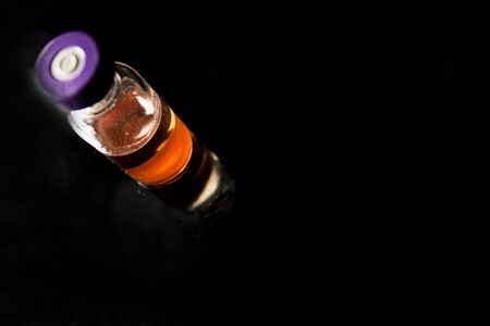 Small drug bottle (phial) with medication in it before admixing for injection, isolated on black background with copy space