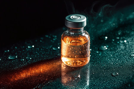 A small vial filled with a luminous orange liquid sits on a dark, reflective surface. Droplets of water cling to the glass, catching the light and creating a mystical atmosphere.