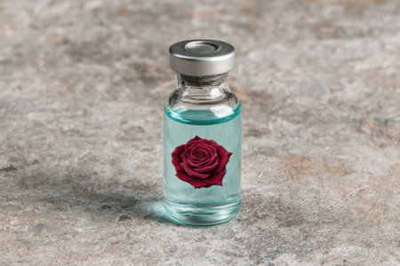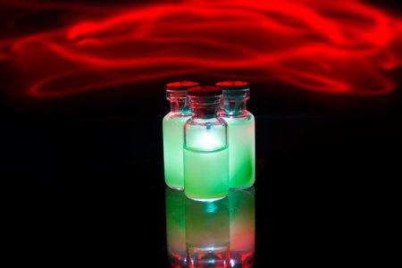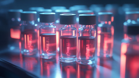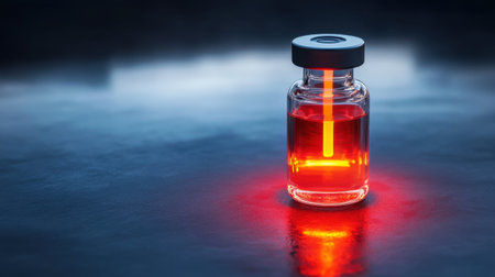 A captivating image of a glass vial filled with vibrant red liquid, subtly illuminated against a dark background, perfect for themes in science, health, and modern technology.