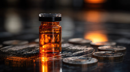A glass vial filled with vibrant orange liquid sits on a table surrounded by coins, capturing a unique blend of finance and innovation within a modern setting.