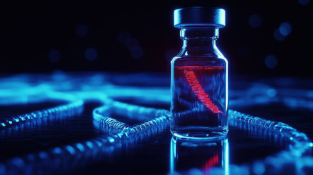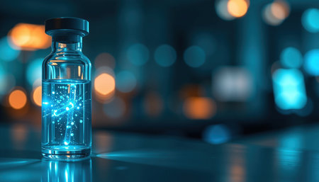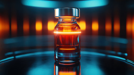 A transparent glass vial filled with a glowing substance sits on a digital background, symbolizing the intersection of biotechnology, innovation, and the future of medicine.