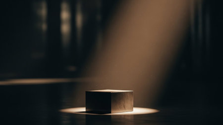 A square metallic pedestal is dramatically lit by a single spotlight in a dark, atmospheric setting, casting a strong shadow.