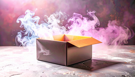 Open cardboard box with smoke on a dark background. Selective focus.