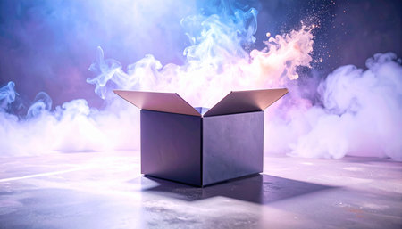 An imaginative representation of a cardboard box from which bright particles and lights are emerging, symbolizing creativity and innovation in a modern design.